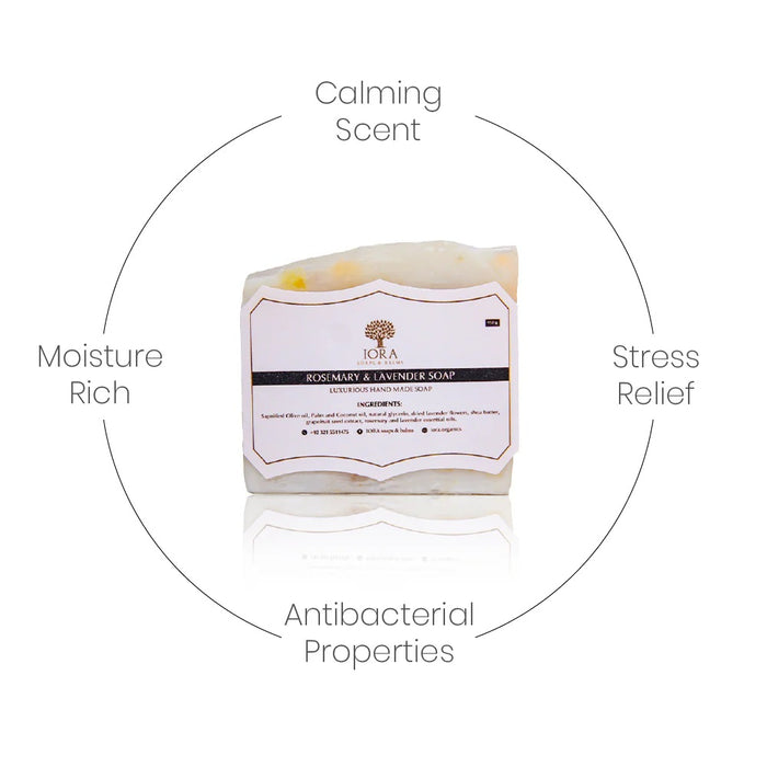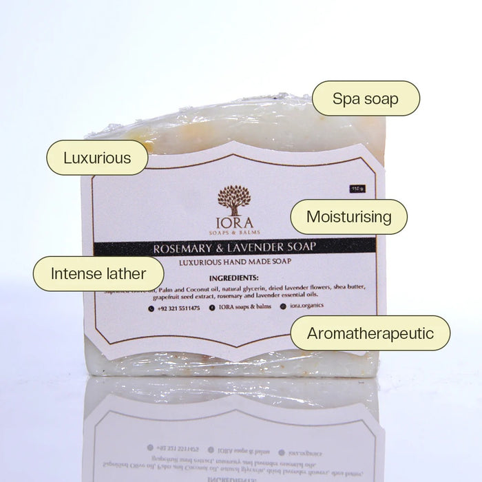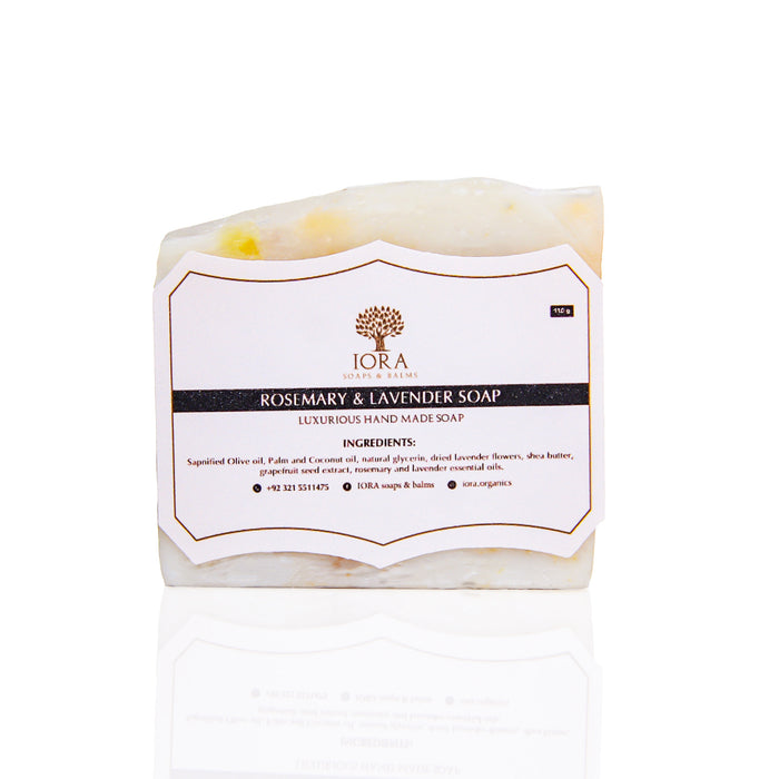Refresh and soothe your senses with IORA’s Rosemary & Lavender Soap. This beautifully crafted bar combines the calming essence of lavender with the revitalizing aroma of rosemary, enriched with natural glycerin and shea butter for deep moisturization. Dried lavender flowers provide gentle exfoliation, while rosemary and lavender essential oils offer their renowned antiseptic and relaxing benefits. Perfect for a restorative, aromatic cleansing experience that leaves your skin soft, refreshed, and beautifully scented.